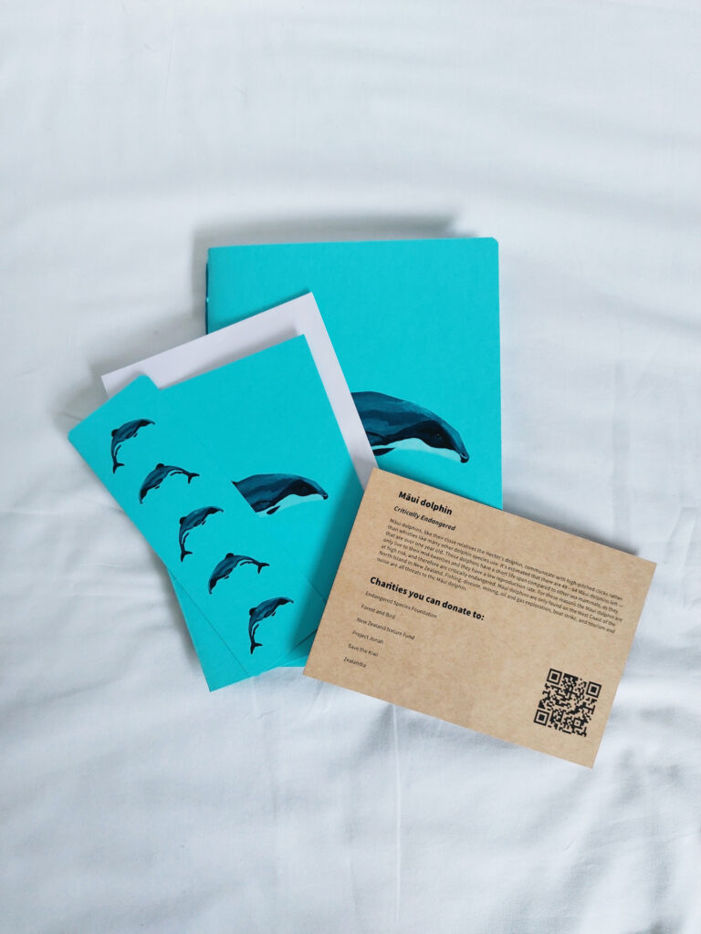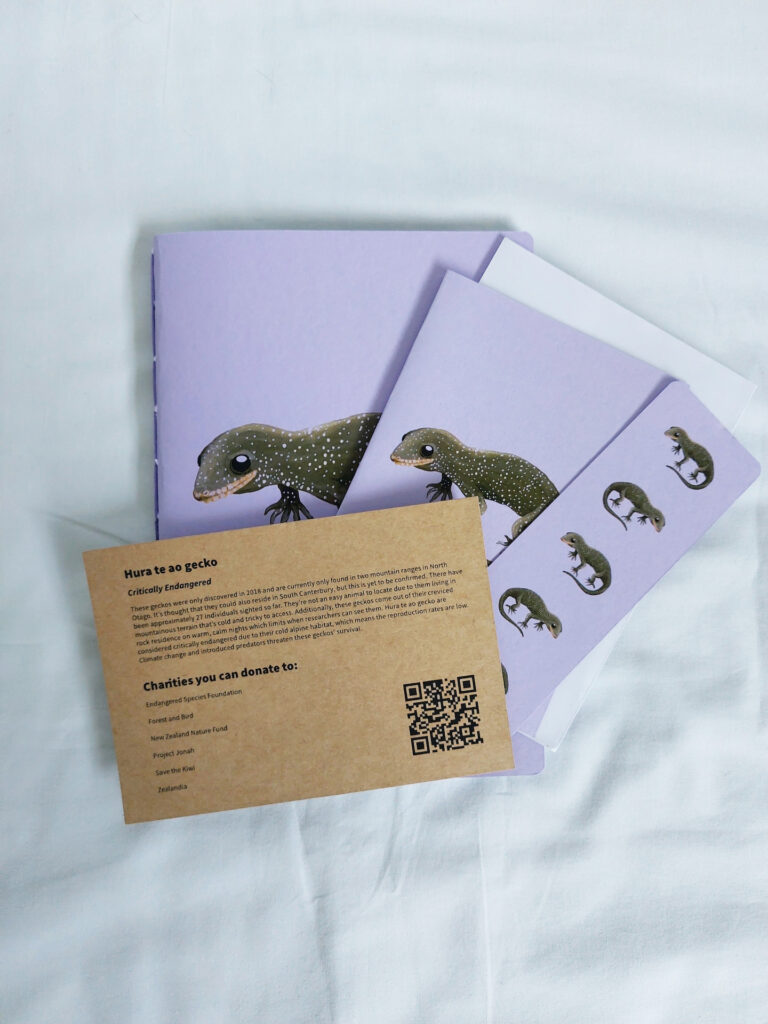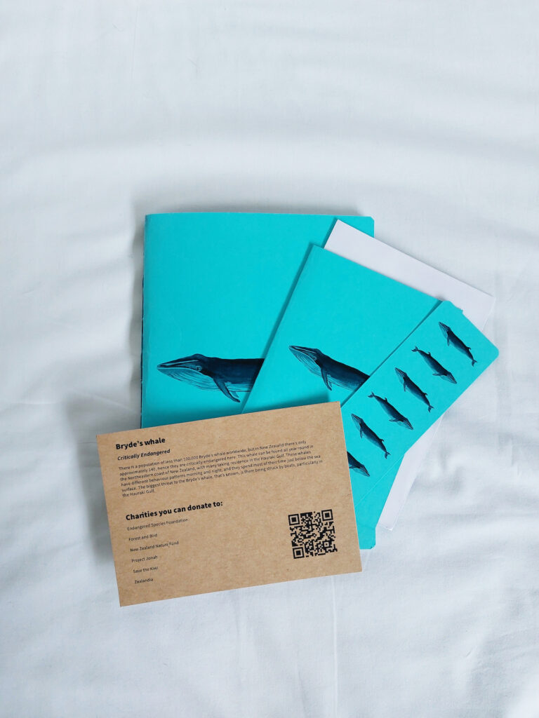 I have painted and scanned images of the wildlife. My stationery collection includes notebooks, greeting cards, bookmarks, a tote bag, and information cards. I’ve kept the designs simple to let the endangered animals shine.