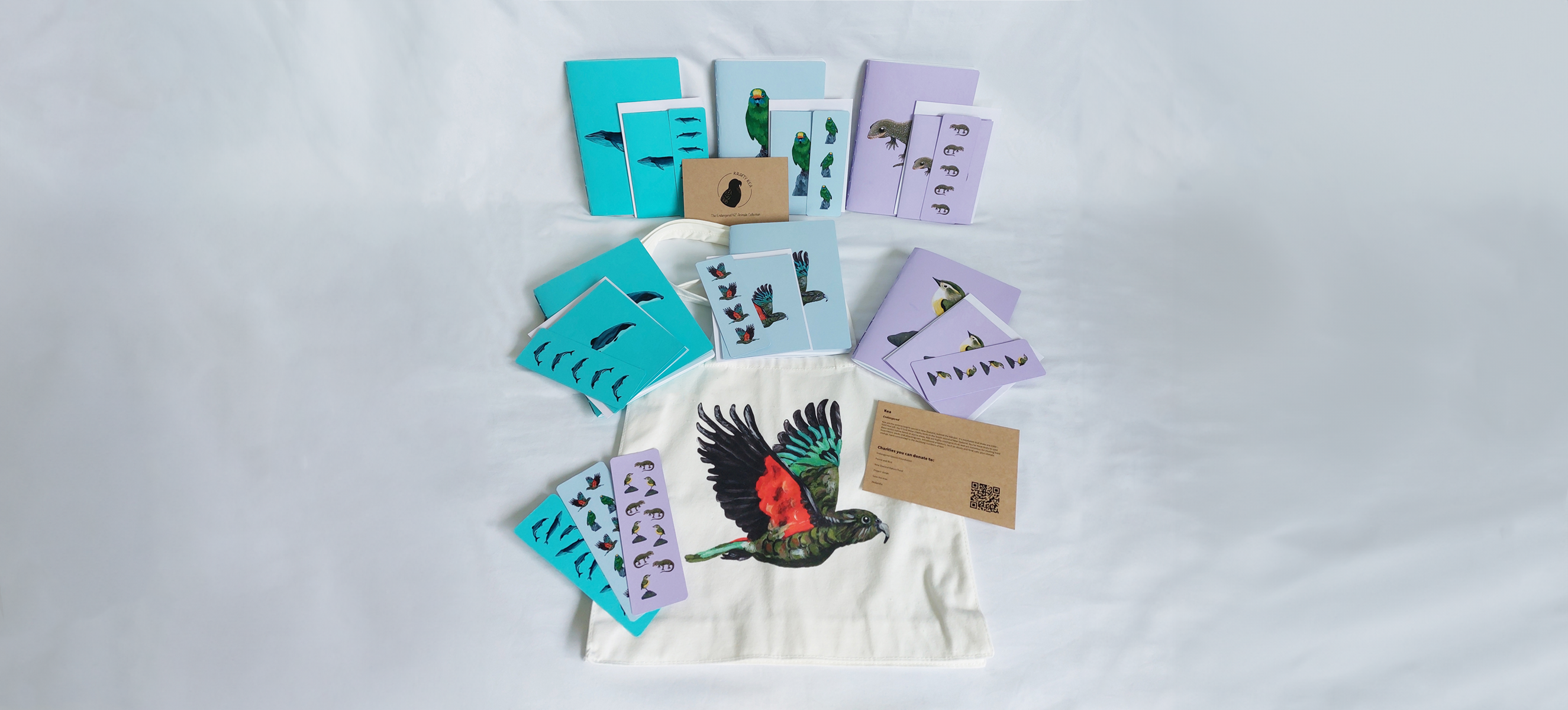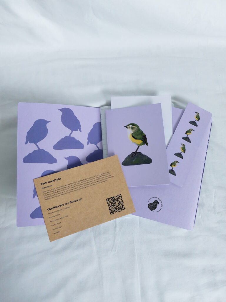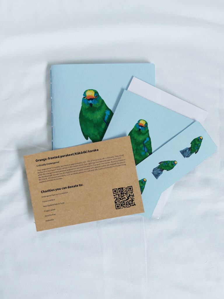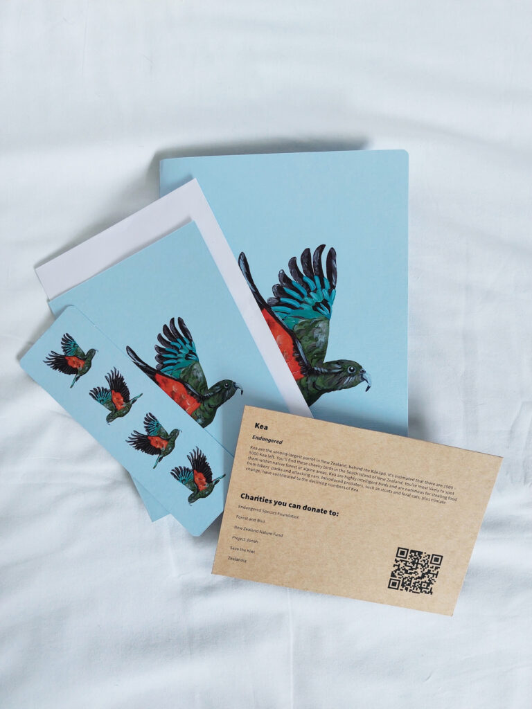 I created Krafty Kea, a stationery collection that advocates for endangered animals in Aotearoa New Zealand. To finalise my degree I wanted to design products that showcased my roots in painting, and my passion for using my design practice to help animals.