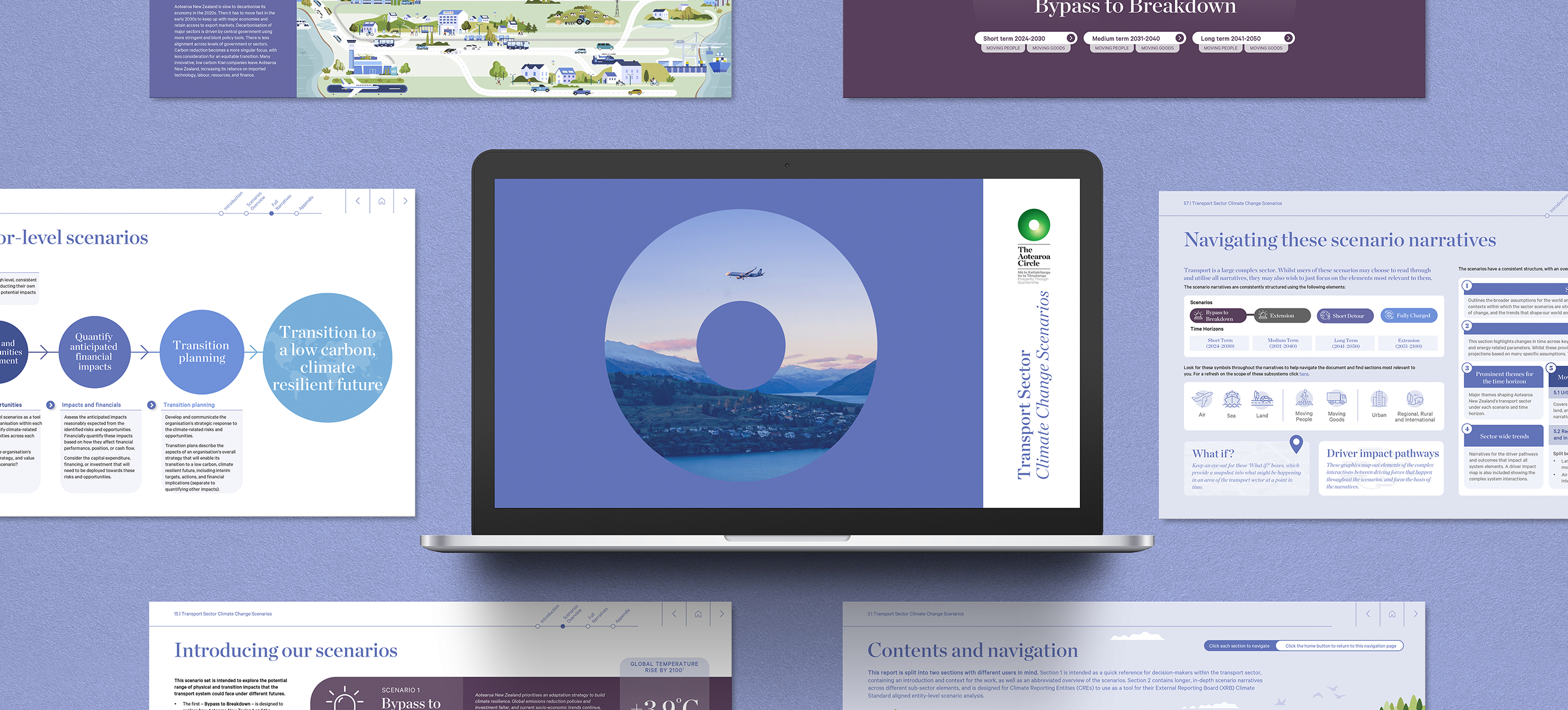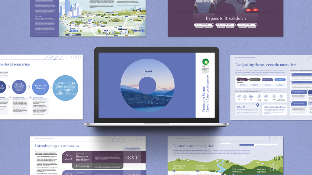 One of the most rewarding design projects I’ve worked on in the last year has been the design of the Transport Sector Climate Scenarios report, produced by Aotearoa Circle and KPMG. The report explores three different climate change scenarios, highlighting potential impacts on New Zealand’s transport networks, if we fail to adapt or mitigate the worst effects of climate change.
