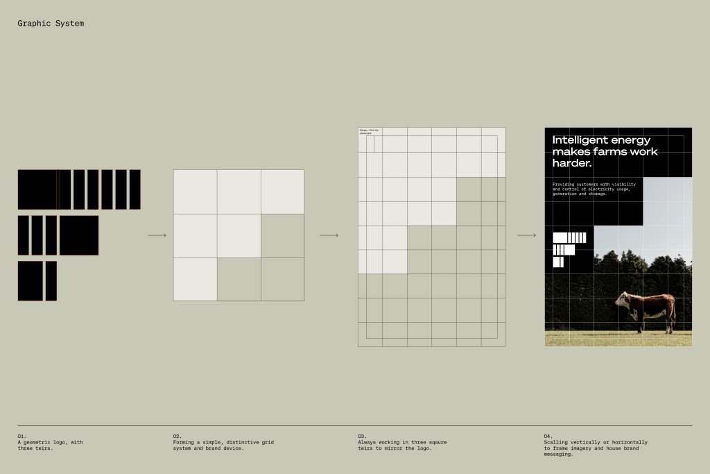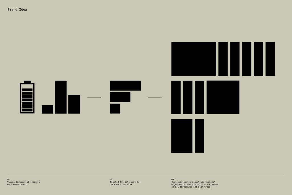 At the heart of the brand is the logomark, a visual expression of technology and performance. It draws from the visual language of data bars and energy infographics, symbolically embedded into the land. The varying bar sizes represent the diversity of types of farms and scale of paddocks, sheds, utilities, and terrain while subtly forming the letter ‘F’ for FLEX. The logo is confident and authoritative with sharp, geometric lines that reflect the precision, discipline, and technical expertise of farmers.