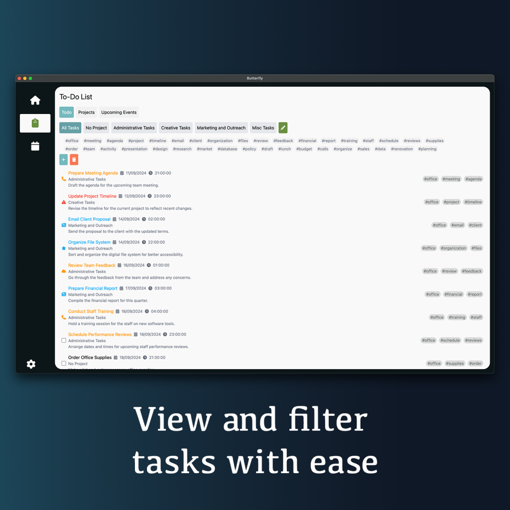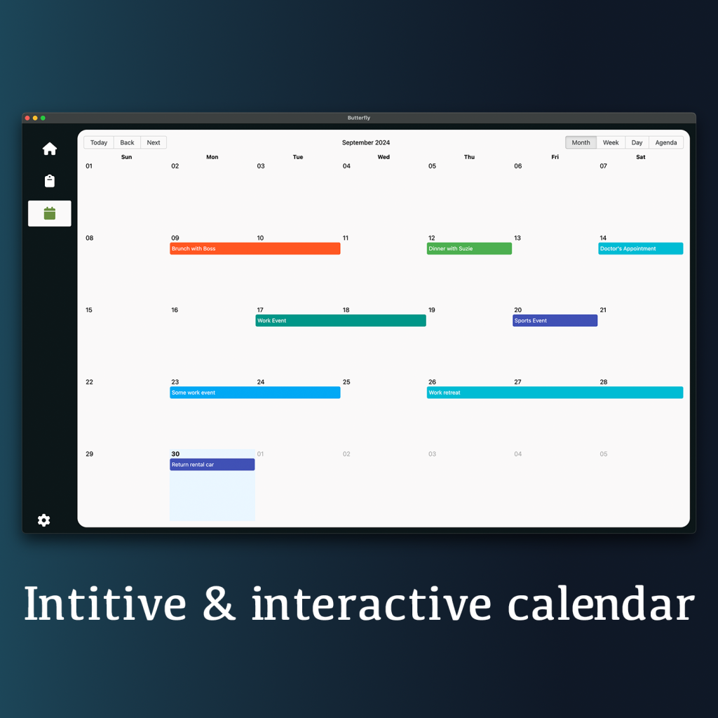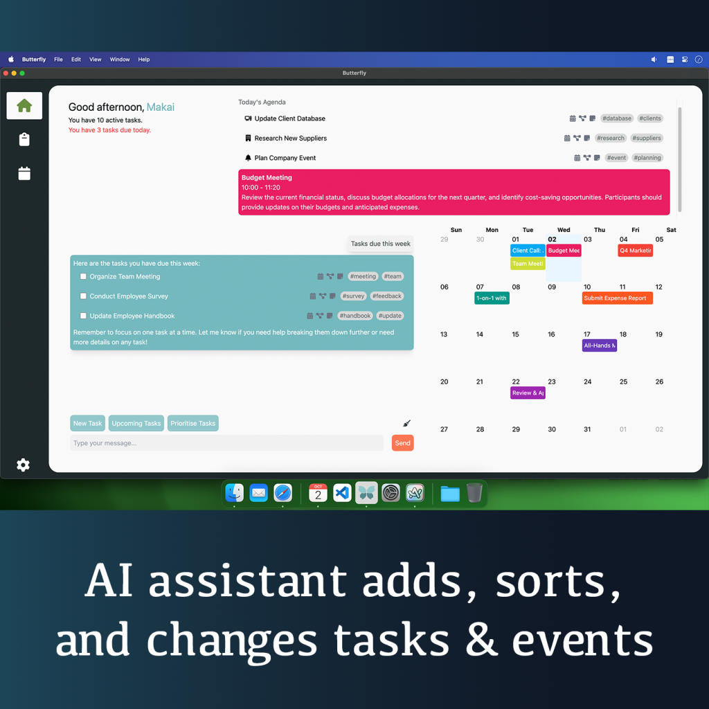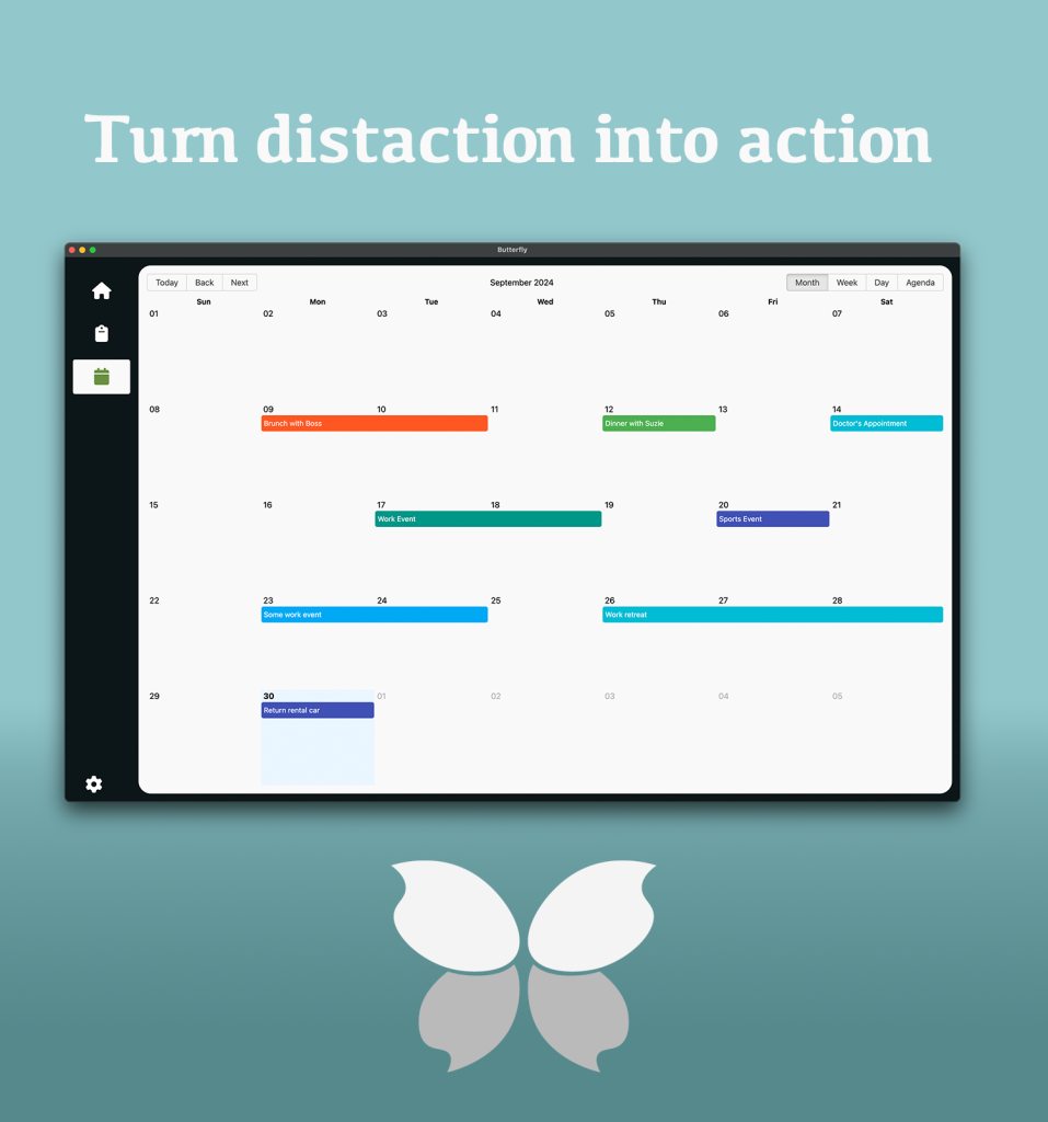 Butterfly integrates an automated calendar, a smart to-do list, and an AI assistant, allowing users to organize their workload intuitively. My goal was to create a tool that not only improves productivity but also reduces overwhelm—a key challenge for ADHD professionals. The design prioritizes clarity, accessibility, and ease of use, with a neurodivergent-friendly interface that leverages thoughtful color schemes, typography, and interaction design to enhance focus and engagement.