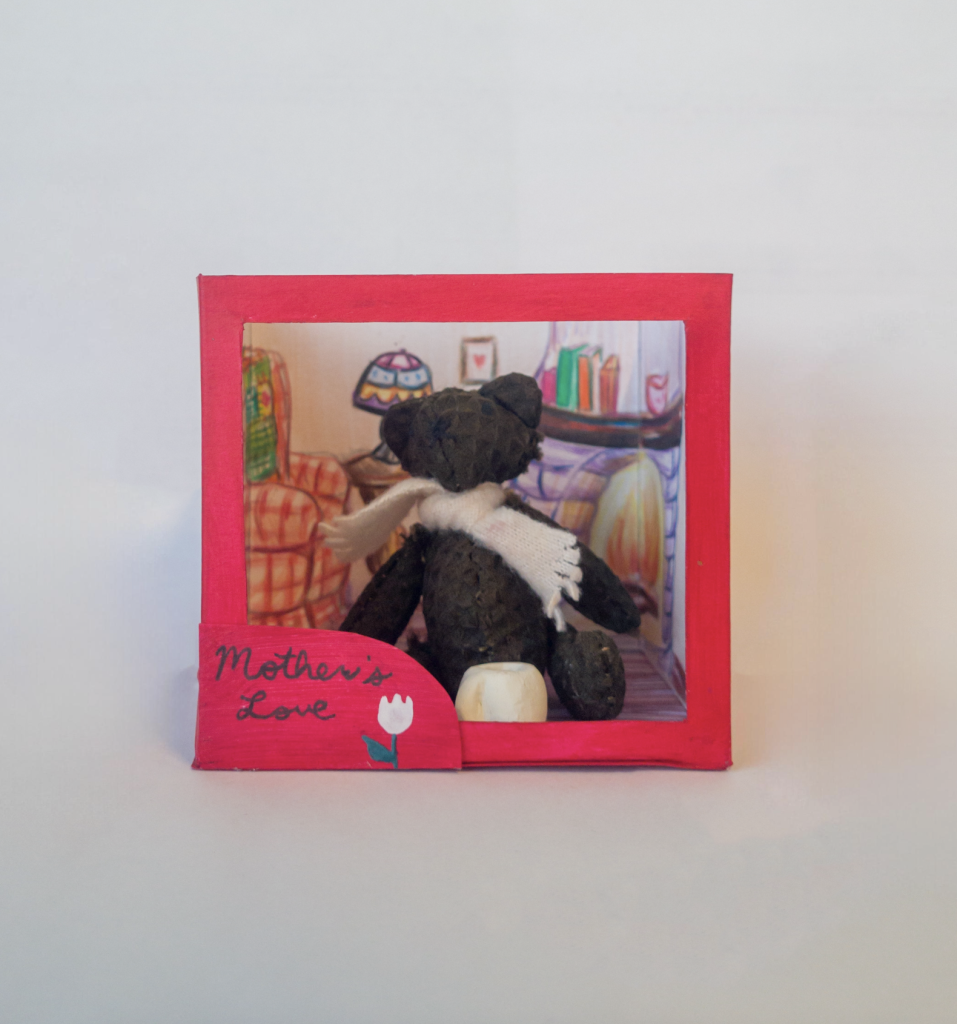 sculpture and mixed media. Each bear embodies a stage of Thumbelina’s journey: from the warmth of maternal love that brings her into existence, to a flimsy, surface-level affection based on appearances, and then a rigid, transactional kind of love driven by security rather than emotion. The tactile choices of plush fabrics, cracking clay, and delicate card which mirrors the emotional tone of each phase. In a reimagining of the fairytale’s ending, the nal bear represents a departure from traditional romantic endings, celebrating instead the power of self-love and autonomy. The collection invites viewers to reflect on the ways love is offered, received, and ultimately chosen.