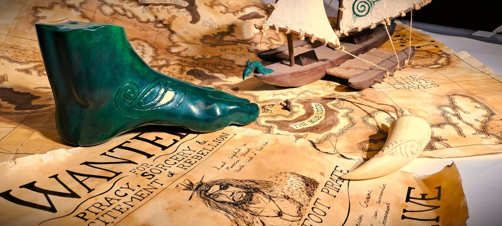 This exhibition follows the story of Pounamu Waewae, a notorious Māori pirate whose name became legend across the seas of Te Ao Pakiwaitara. Known for his carved greenstone foot and his bond with a powerful sea-dwelling manaia, Waewae fought back against colonial forces during the rise of the Southern Dominion. Through this collection of artefacts, taonga, and recovered relics, He Ao Ngaro invites you to explore the blurred line between history and myth. These fragments offer a glimpse into a world reshaped by resistance, guardianship, and rebellion. Each item speaks to Waewae’s legacy as both a protector and a pirate, a defender of the weak and disruptor of empires. Whether he was a hero, an outlaw, or something in between, the world he left behind endures, if only in fragments. His story, like so many others, survives in pieces, washed ashore from a forgotten age.