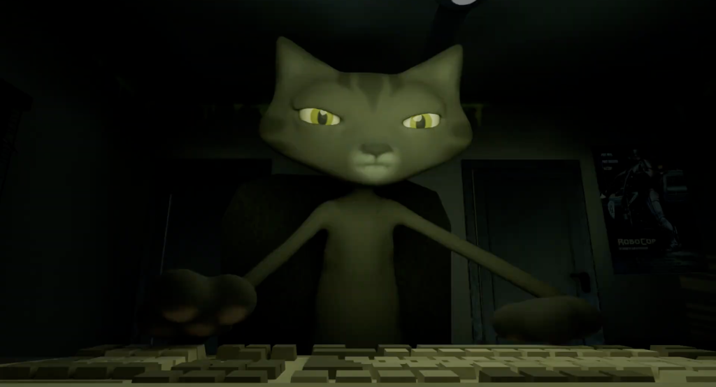 A short animation explores the world of a shut-in keyboard warrior of the late 1980’s. Through environmental storytelling and set dressing, Katerina Marsh illustrates the protagonist’s unhealthy, obsessive mindset leaking into, and ultimately consuming, his surroundings. The piece draws inspiration from a wide range of animated works. The protagonist’s design however is directly influenced by Katz, an antagonist from the cartoon Courage the Cowardly Dog. Katerina Marsh says, “This stylised, strange look I drew from his design helped me to achieve the uneasy, cartoonish tone. The piece was created entirely in the 3D software Blender.”