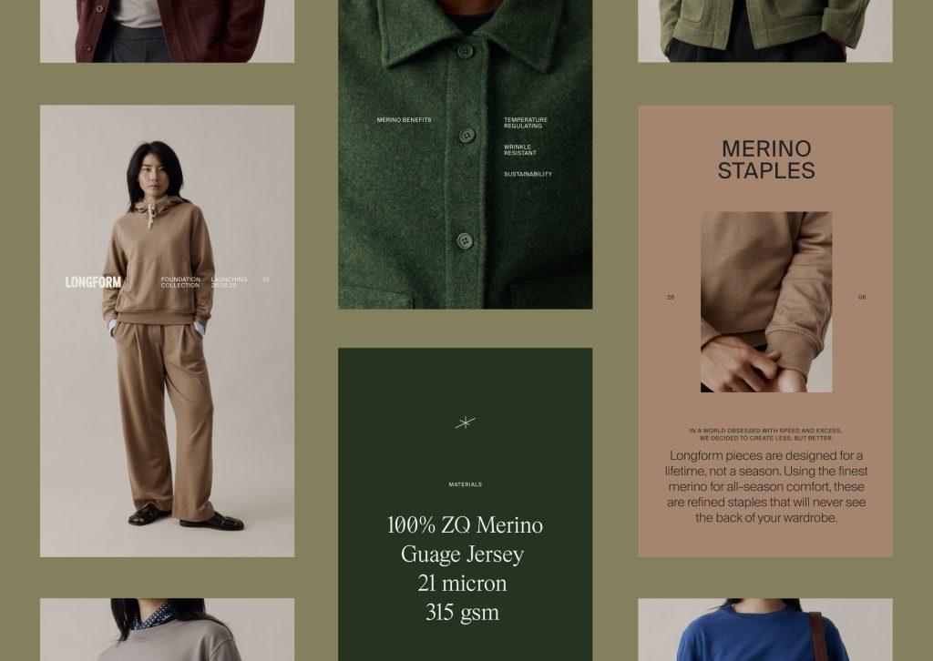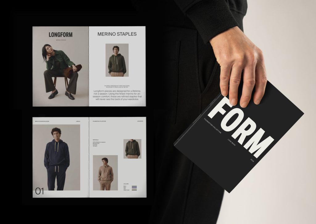 What sets Longform apart is the discipline behind every decision, an unwavering focus on clarity and intention. The brand design embraces this restraint, stripping away the non-essential to reveal strength through simplicity. From strategy to execution, the system is cohesive and is carried through every layer, from garment details to tone of voice, creating a brand that feels coherent, not just consistent. Longform doesn’t chase attention; it builds connection over time, offering a thoughtful, enduring alternative to fast fashion.