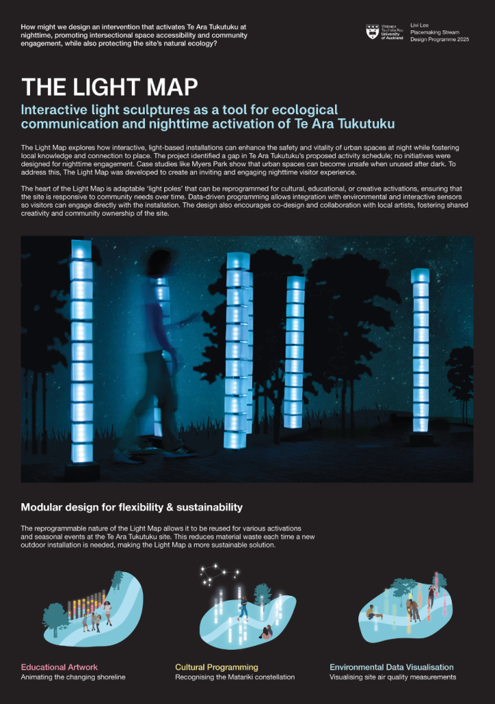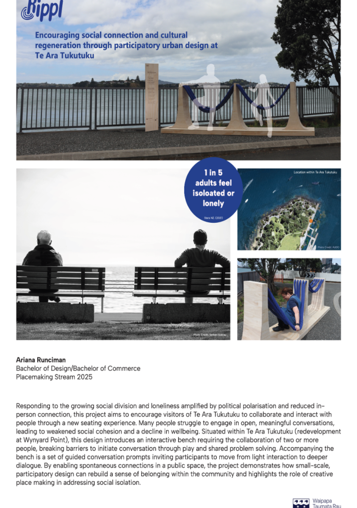 - The Placemaking stream, co-developed with Eke Panuku Development Auckland, reimagines the Te Art Tukutuku waterfront public space weaving social, cultural, economic, and environmental value.
