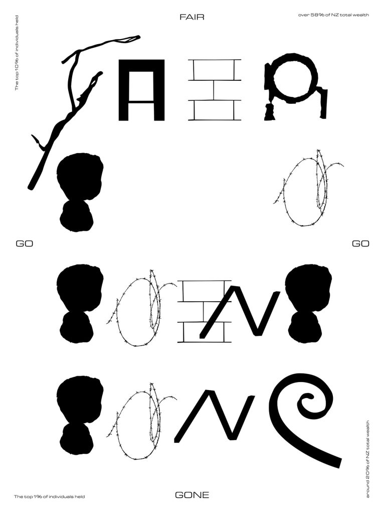 This poster employs one of these experimental alphabets to examine “Fair Go” — a fundamental New Zealand cultural value rooted in equal opportunity that has fragmented under growing wealth inequality. The alphabet, constructed from unintentional letters found in everyday neighbourhood textures, visualises this erosion.
