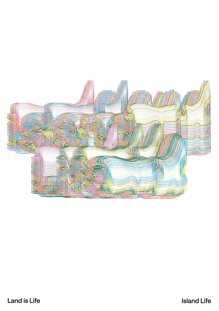 Land Is Life rotates the landform of Aotearoa around an axis, layering it in multiple colours to create a fine, textured effect reminiscent of the linework used in passports and banknotes.