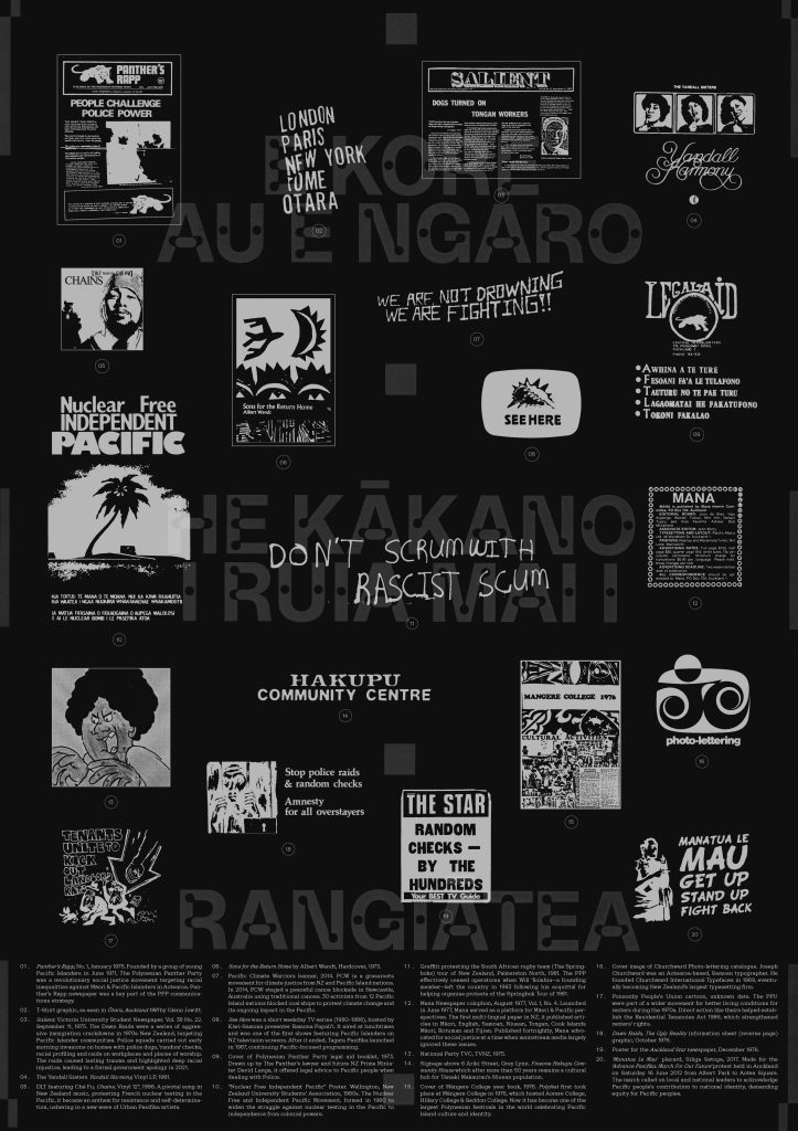 It was this self-determination and spirit that I wanted to communicate through the lens of the typography created by these groups. The poster is a type collage, pulling from t-shirt graphics, legal aid booklets, hand-drawn placards, graffiti, newspaper headlines, art, album covers, type catalogues and TV screens, set against a whakataukī that speaks to heritage as a foundation of self and to provoke the question: What is Aotearoa’s own Pacific identity?