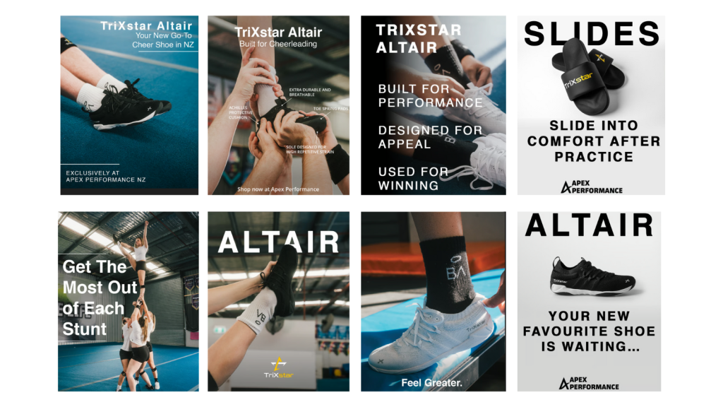 This project rebuilds Apex Performance NZ’s social media identity to reflect the premium positioning the brand holds within the cheerleading community. Max developed a comprehensive social media style guide, refined brand language systems, and created scalable content templates alongside batch-planned posts and Meta ads. The resulting visual direction is cohesive, high-quality, and designed to support consistent execution and stronger organic and paid campaign performance.