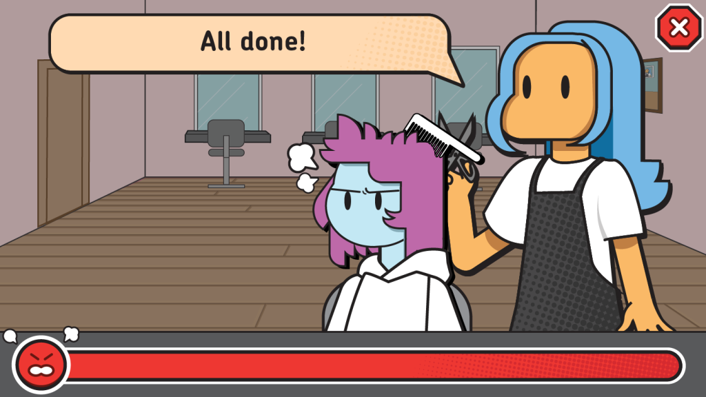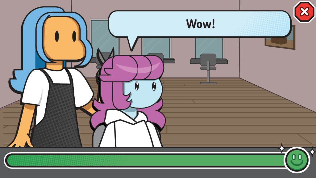 The hairdresser’s role is more challenging, as this is meant to be the position of power. Dialogue options move and dodge the cursor if players are too hasty, encouraging being mindful in communication. Players must also pay attention to any nonverbal cues, as one client won’t speak up for themselves but will instead react visually.