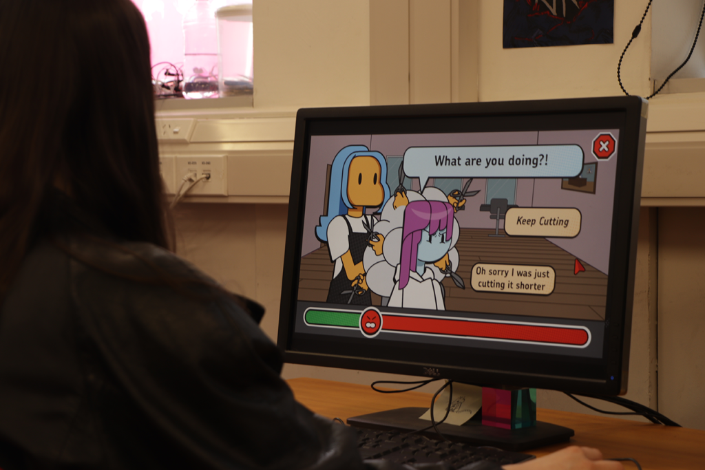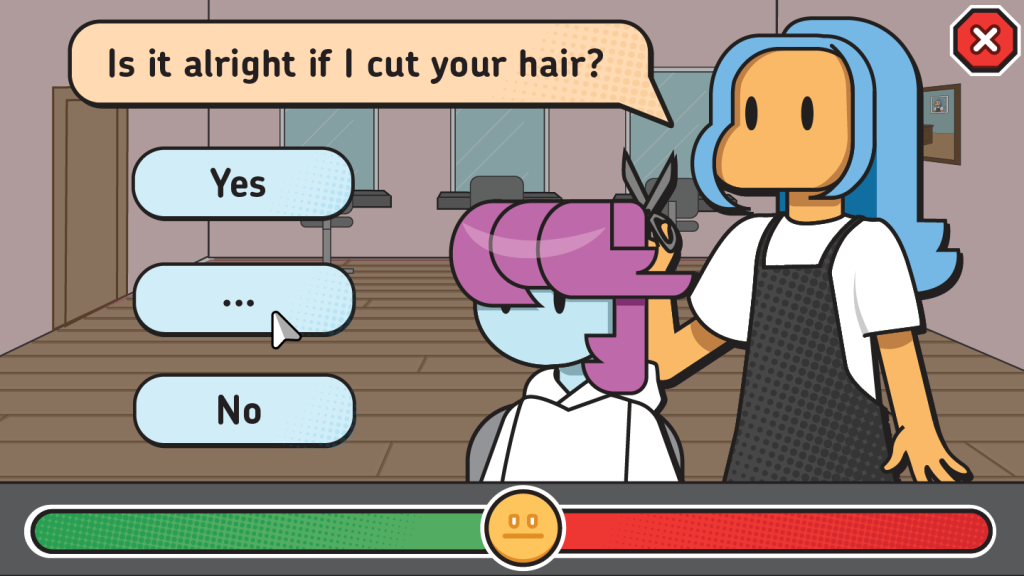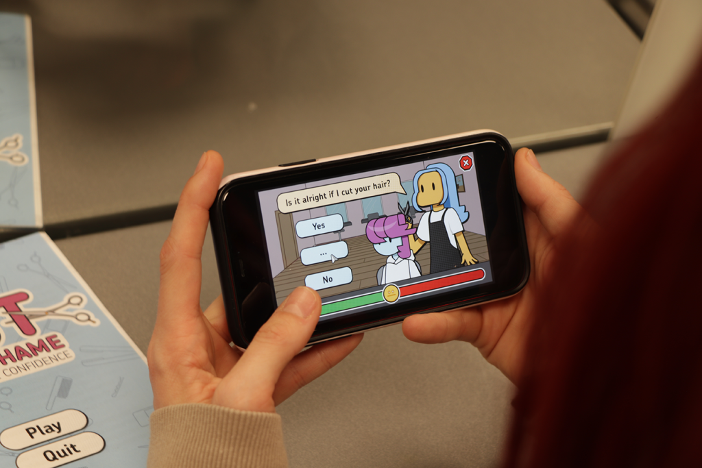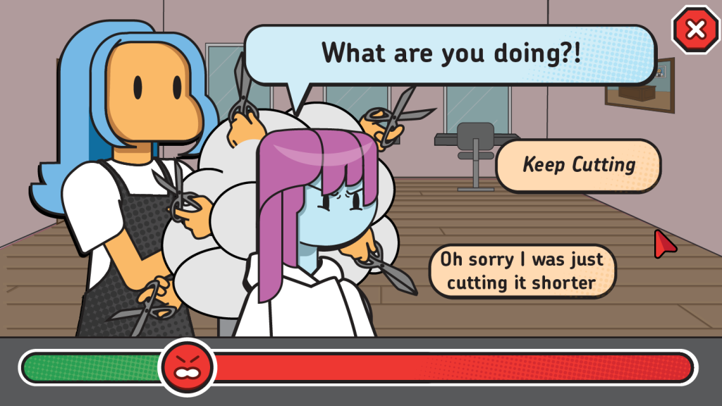 Cut the Shame is a game designed to teach Year 9–10 students about consent through a hairdressing simulator. Players can choose to play as either the client or the hairdresser, with the main goal being to keep the client comfortable throughout the appointment.