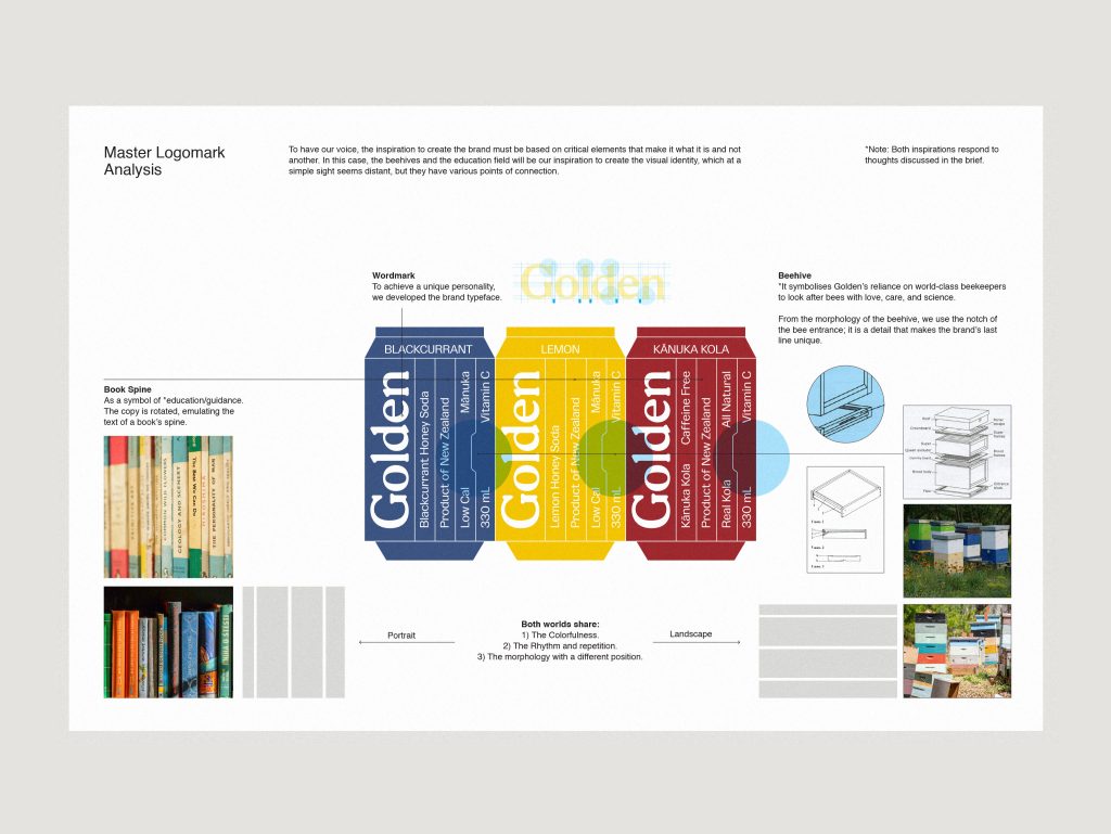 The design strategy captures the energetic spirit of a sweet drink while differentiating itself from standard “guilt-free” options. The visual identity is inspired by two distinct elements: beehives (representing quality beekeeping) and education (symbolised by book spines and the pursuit of knowledge about bees). Drawing on the stacking structure shared by both hives and books, the identity utilises lines as a primary visual tool. This creates a new, accessible design language that feels both premium and familiar, challenging stereotypes and moving beyond the binary of healthy vs. tasty.
